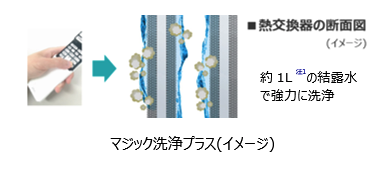 ●約1Lの水でエアコン内部の汚れを洗い流す「マジック洗浄プラス」。 新搭載の「マジック洗浄プラス」は、手軽にエアコン室内機の熱交換器を洗浄する機能です。リモコンで「クリーニング運転」を実行すると、1時間で発生させた約1Lの結露水でエアコン内部の熱交換器の汚れをしっかり洗い流します。カビが気になる梅雨時や本格的な冷房シーズンを迎える前等、エアコン内部の汚れが気になる時に使用することで、いつもキレイな状態に保つことができます。