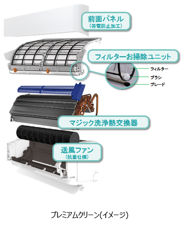 日常のお手入れは従来の「プレミアムクリーン」が、熱交換器についたホコリ等の汚れを常に洗い流して屋外に排出、さらに運転を停止したあとはブラシとブレードが自動でエアフィルターの両面を掃除し、セルフクリーン運転(乾燥&プラズマ空清)で送風路を脱臭、付着菌を減少させ、ホコリの付着やカビの発生を抑えます。