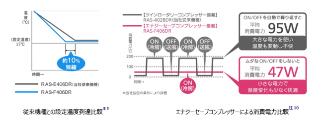 設定温度に到達した後は、「エナジーセーブコンプレッサー」による安定した小電力運転で、電気のムダを抑えながら注10温度変化の少ない快適な環境をキープします。