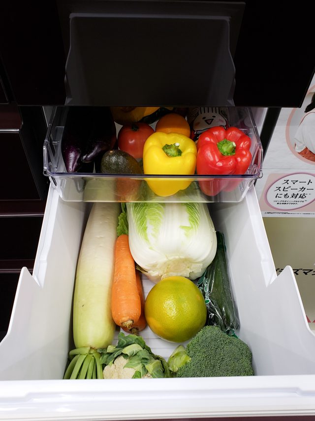 また、野菜収納で困るのは、ギチギチには入れられないこと。しかし、丸ごと冷蔵しておきたいことですが、シャープの野菜室は、深さ:28.5cm、奥行:58cmですから、丸ごと入れるのは超簡単。