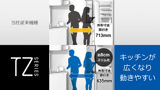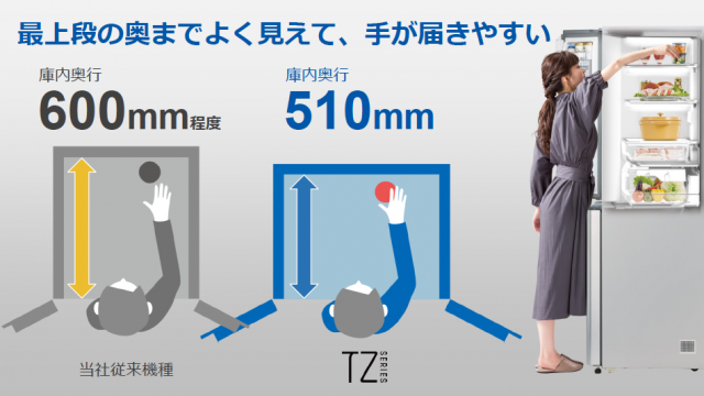 『AQR-TZ51H』のよさは、まずサイズです。幅:888mm、奥:635mm、高:1825mm。黄金比ではありませんが、単独で均整ががとれています。幅より奥行きが大きい、今ありがちな「ボテ腹」ではありません。