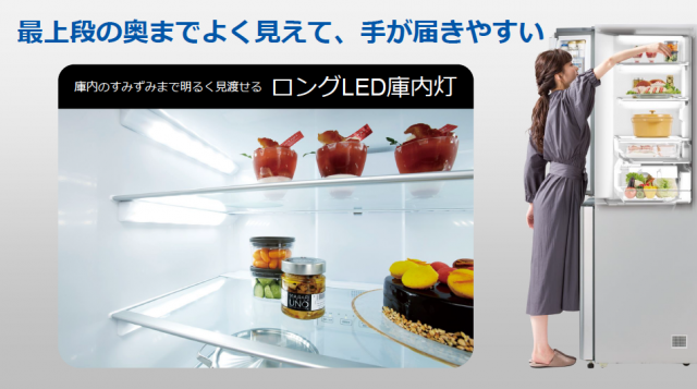 7灯。冷蔵庫内って薄暗いと思っている人も、まだいると思います。しかしLED照明ができた今、庫内は明るいのが当然。しかし、それでも室内には食品がごっちゃりあるわけですから、ところどころが暗くなります。このためにLEDは7灯。ショーケースのような明るさとなっています。