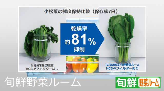 野菜室は半密閉構造で、湿度コントロールもできるタイプになりましたので、一週間程度なら葉物野菜でも乾燥で干からびるなんてことがなくなりました。