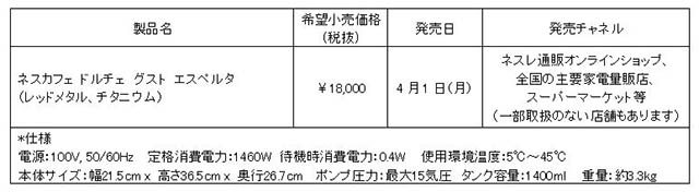 ネスレ日本(株)から、 世界累計出荷台数5,000万台(2018年12月末時点)を突破したカプセル式本格カフェシステム「ネスカフェ ドルチェ グスト」シリーズより、「ネスカフェ ドルチェ グスト エスペルタ」(以下「エスペルタ」)が、4月1日(月)に、希望小売価格:18,000円(税抜)にて新発売されます。