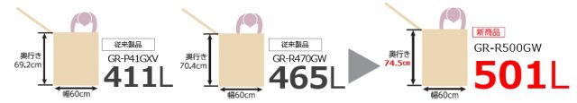 この様な背景から冷蔵庫の購入時において、鮮度保持性能や収納容量が重視される一方で、設置スペースには幅60cmの制約があるお客様が多くいます。これに基づき、東芝は「省スペースで設置可能な大容量の冷蔵庫」という要望に応え、好評の60cm幅465L収納の製品に加えて、同幅では業界初となる501Lに収納量を向上した製品を開発導入します。