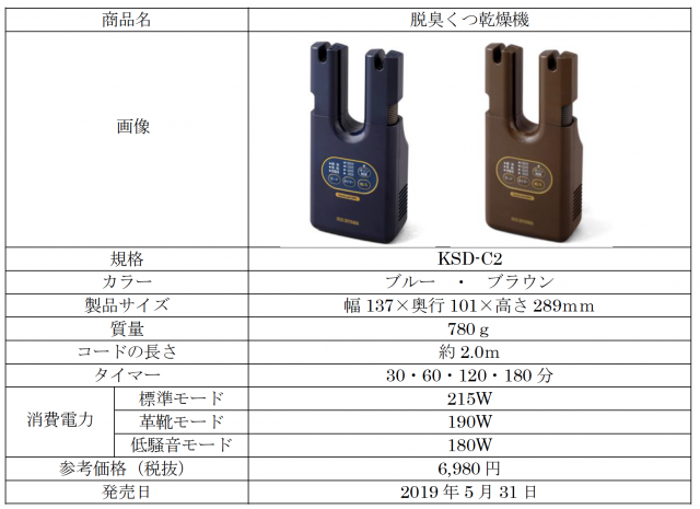アイリスオーヤマ(株)から、「脱臭くつ乾燥機 カラリエ」を、新たに革靴をイメージした2色で、2019年 5月31日、6,980円(税抜)で発売されます。