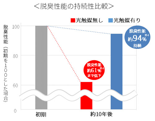 フィルターの方は、光触媒の作用で、10年後でも、94%の脱臭性能を維持だとか。ちょっと差がありすぎるように思います。