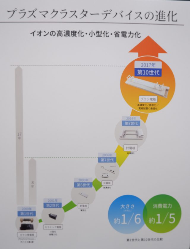 プラズマクラスターは、2000年10月に、プラズマクラスター搭載空気清浄機『FU-L40X』でデビュー後、「高濃度化」「小型化」「省電力化」を目指し改良を重ねてきて、今は3つのタイプになっています。