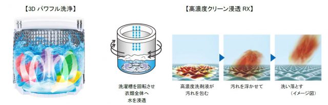 「高濃度クリーン浸透RX」は、少ない水量からパルセーターを回転させることで、洗剤を素早く溶かし、高濃度の洗剤液を繊維の奥まで浸透させて洗います。