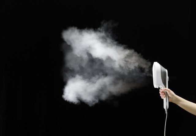 ■袖も背中も、服を一気にシワ伸ばし。 ハンガーにかけたままアイロンがけ、脱臭ができる「ハンディーアイロン&スチーマー」。従来品のパワフルさはそのままに、よりワ イドなスチームで、シャツの袖や前身頃、背中といった広い範囲も、一気にシワを伸ばせます。スチーム噴出口幅を約11cm※ に広げ、スチームの通り道を放射状にしたことで幅広の噴霧を実現(特許出願中)。フリルやドレープのあるおしゃれ着や、ジャ ケットなど立体的な服におすすめです。