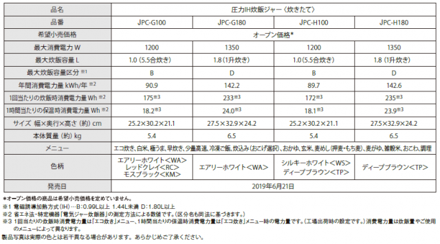 タイガー魔法瓶(株)から、「圧力IH炊飯ジャー『炊きたて』JPC-G型、JPC-H型」が、2019年6月21日に発売されました。