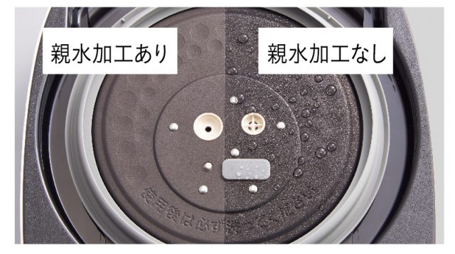 ●保温もおいしく「つや艶(つや)内ふた」 内ぶたには親水効果のある加工を採用。しずくになりにくく薄く膜を張ることで、加熱時には素早く蒸発し不要な水分を取り除き、保温時には水分の膜を張ってごはんをしっとり保温します。水滴になりにくいので、つゆだれも防ぎます。
