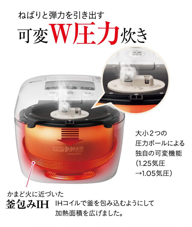 ●もっちり、 しっかりした食感「可変W圧力炊き」 大小2つの圧力ボールを制御し、ねばりを引き出ししっかり炊きあげます。炊きあげ時に1.25気圧の圧力をかけて粘りともちもちした弾力を引き出します。炊きあげ後は1.05気圧の高温蒸らしにより、ごはん粒を炊きしめ、べたつきをおさえたしっかりとしたごはん粒に仕上げます。