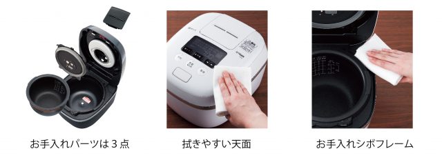 本体は凹凸が少ない天面なので拭きやすく、「お手入れシボフレーム」加工でおねばがついてもはがれやすくなっており、 毎回のお手入れも楽にしていただけます。