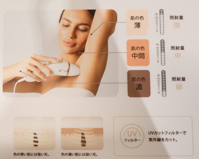 しかし、家で行う場合は自分です。「脱毛のプロ」ではありません。そのために、その能力を脱毛器に組み込んだのが「シルク・エキスパート」です。中でも「シルク・エキスパート PRO5」は、肌、体毛の色に合わせ、照射量を10段階に分け、より合った光を照射するようにしています。(PRO3は3段階)