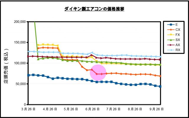 それが一番分かりやすいのが、CXシリーズです。CX、Eのベーシックは夏のボーナス商戦の目玉ですから、差が分かりやすいのです。6月までと7月以降で、グラフの傾きが違うのがお分かり頂けると思います。