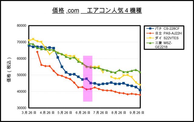 エアコンの価格は導入後、しばらくして値をがくんと下げます。これで、ラインナップ順の価格にします。そして、あとは緩やかに値を下げていきます。ラインナップ順になるときの値下げは、一週間で数万円下がるのは当たり前です。買うのに余り良い時期とはいえません。