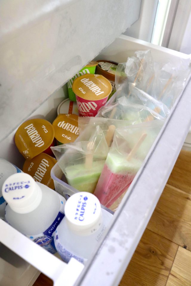 これまで使っていた我が家の冷凍室は小さく、常にパンパンでした。上に置いてあるものをどかさないと、どこに何があるかのか分からなくなってしまい、とても使いづらかったです。 “セカンド冷凍庫”を導入したことで、カテゴリー別に収納出来るようになり、 そのストレスが解消されました。毎週末の息子達の野球に必ず持っていく凍らせたドリンクも収納でき、子どもたちが大好きなアイスもまとめ買いができるようになってとても助かります。部屋に馴染むデザインもお気に入りのポイントです。