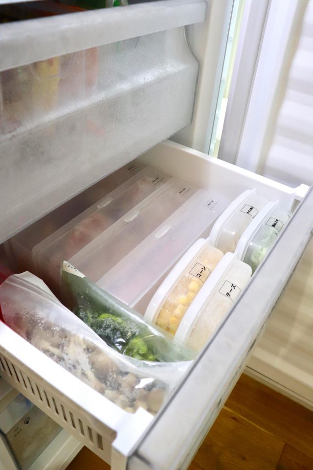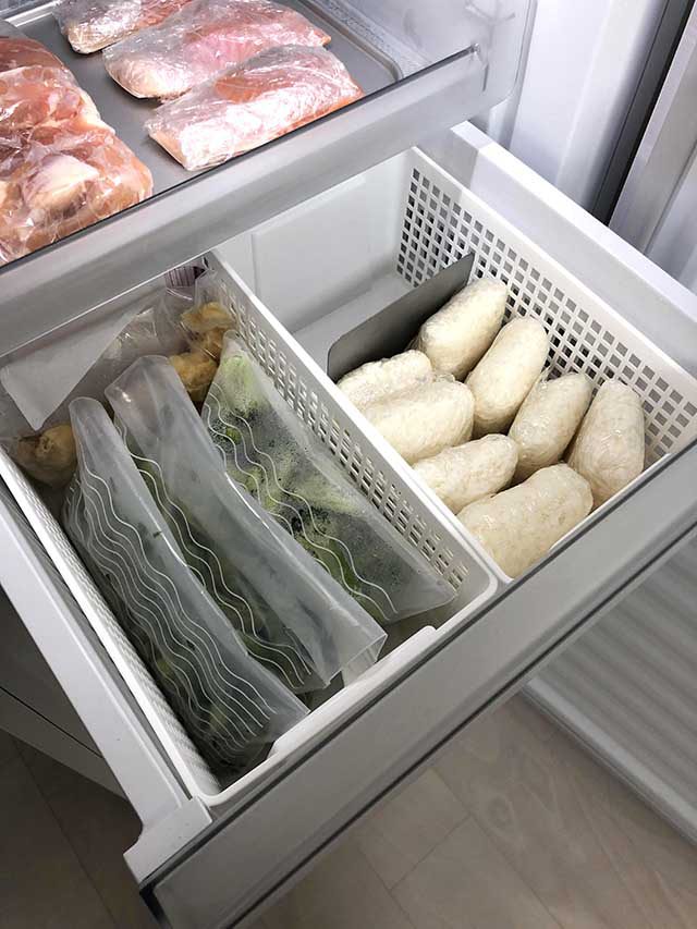 冷凍ご飯はブックスタンドで仕切りを作って直立整列させることで省スペースを。 下茹でした野菜は、 料理の時短と同時に長期保存も可能に。