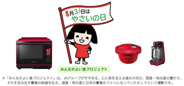 シャープは、8月31日「やさいの日」にちなんで、JA全農と共同でウォーターオーブン ヘルシオ、水なし自動調理鍋 ヘルシオ ホットクック、ヘルシオ真空ブレンダーを使って国産野菜を調理実演・試食体験できるワークショップ「やさいの日 特別野菜料理教室」します。