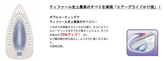 まずかけ面は、特殊セラミックかけ面にさらにエナメルコーティングを施した「エアーグライドかけ面」で、すべりの良さが33%アップ自社比較。ダブルコーティングを施したことによりキズにも強く、ティファール史上最高のすべりと耐久性を実現。