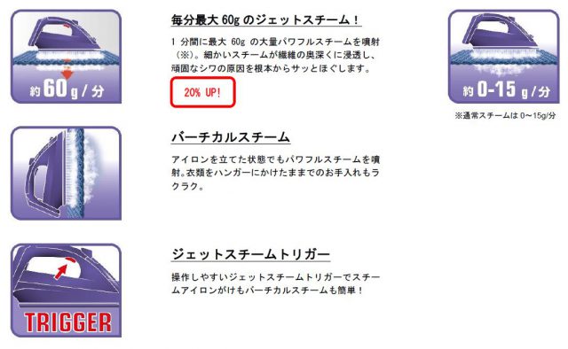 さらに、ジェットスチーム通常スチームは0~15g/分。が50g/分から60g/分に20%アップ!細かいスチームが繊維の奥深くに浸透し、頑固なシワもサッとほぐします。