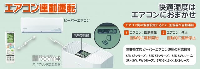 ハイブリッド加熱気化式3機種は、同方式の製品でトップクラスの省エネ性を実現し業界唯一のエアコン連動運転機能を備えており、暖房運転時における室内の乾燥を防ぐことができるのも魅力です。さらに、ハイブリッド加熱気化式加湿器全機種に搭載している三菱重工サーマルシステムズ株式会社製ビーバーエアコンとの連動運転機能の対象機種は、最高級モデル(2015年以降のSRK-Sシリーズ)および高機能モデル(2018年以降のSRK-Rシリーズ)に対応できます。エアコンのセンサーによる湿度検知に基づき、運転・停止の信号が加湿器に送られ、設定湿度をコントロールするものです。また、プリーツ形状の加湿フィルターは交換寿命が8シーズン(SHK50タイプにおいて)と長く、標準装備のAgイオン抗菌剤により水の腐敗や細菌・カビの繁殖が抑えられるなど、メンテナンス性にも優れています。