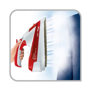 また、コードレスのスチームアイロンでありながら、ティファールのスチームアイロンの特長である大量ジェットスチーム通常スチームは0~25 g/分。を1分間に最大110g噴射。細かいスチームで繊維の奥まで水分が浸透し、頑固なシワも楽に伸ばすことができます。