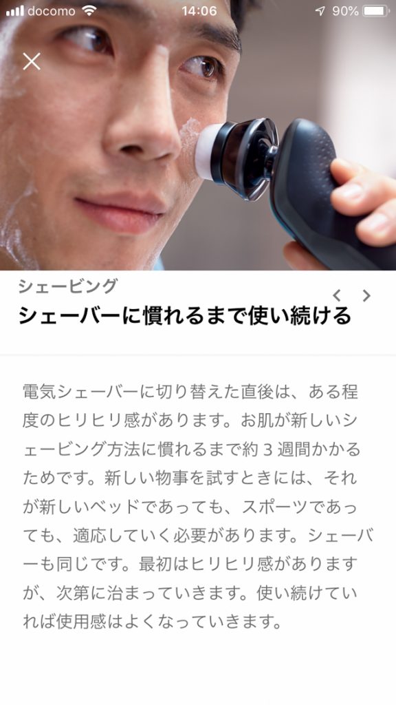 理由は使用時に、スマホでアプリを呼び出さなければならないためです。このため、こちらの機能は、使い初めの数日間で、慣れたらもうイイのではないであろうか?と思えてきます。が、しかし、人はすぐ自分流に成りがち。特に、その場合、上手く剃れているはずなのに・・・と成ってしまいます。