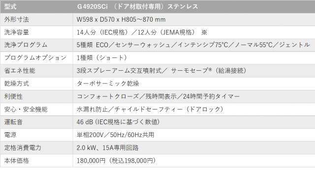 | 製品名 | 食器洗い機 G4920 SCi(ドア材取付専用) |