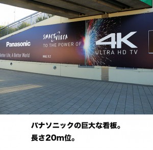 写真は、南ゲートにある自動車プラグで有名な独ボッシュ社の広告オブジェです。洗濯機、冷蔵庫それに食洗機を組み合わせ巨大な立方体を作っています。また、その側にある看板群も、パナソニックこそ4Kテレビの看板ですが、サムソンは掃除機、冷蔵庫、洗濯機の看板を出しています。