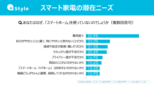一方、「スマートホーム・スマート家電を導入しない理由」に関する設問では、「費用面で」という回答が、過半数の52.9%に達しており、他の回答項目を圧倒しています。