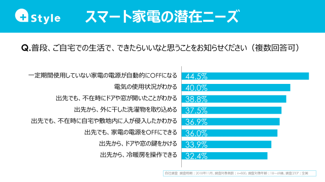 音声コントロールが可能で、自律的に動作する家電は、いわゆる「スマートホーム」「スマート家電」と呼ばれ、今後普及が見込まれる製品です。しかし自社調査の結果、 ユーザーが「自宅で、できたらいいな」と想像する「未来のスマートホーム」は、本モデルをはじめとする+Styleのオリジナル製品ですでに実現していることがわかりました自社調査 調査時期:2018年11月、調査対象者数:800、調査対象年齢・性別:18~69歳 男女、調査エリア:全国。