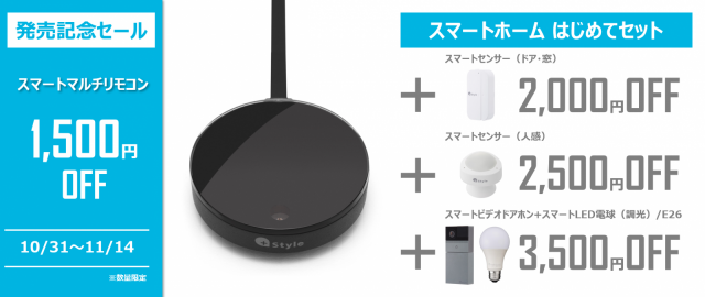 スマートマルチリモコンの販売開始にあわせ、「発売記念セール」と「スマートホーム はじめてセット」の提供を、2019年11月14日までの期間限定で開始します。