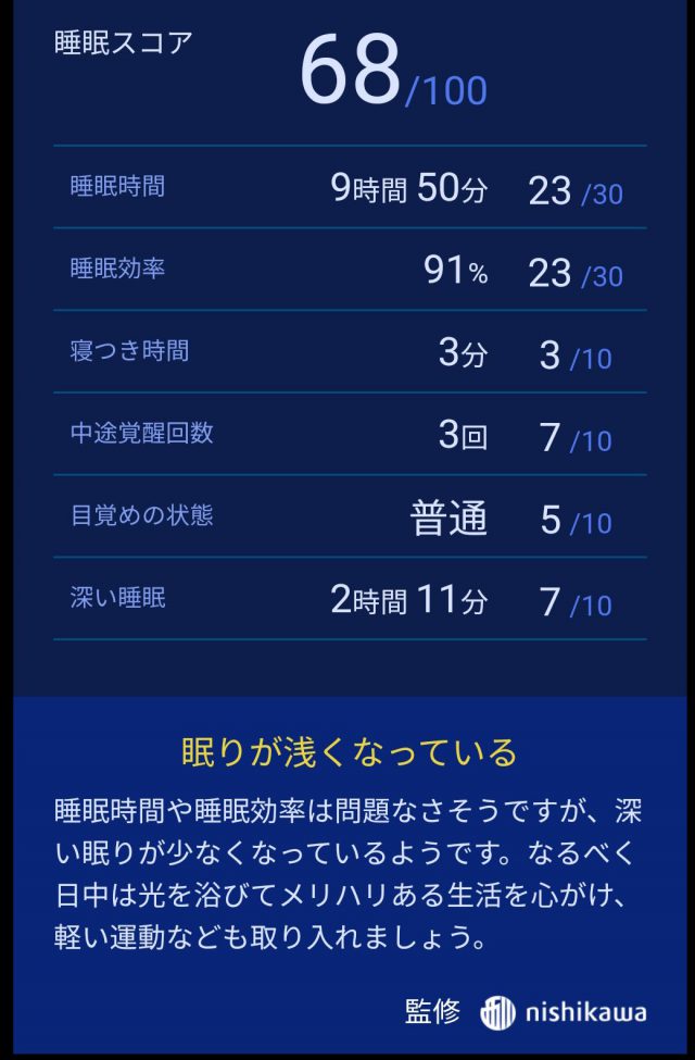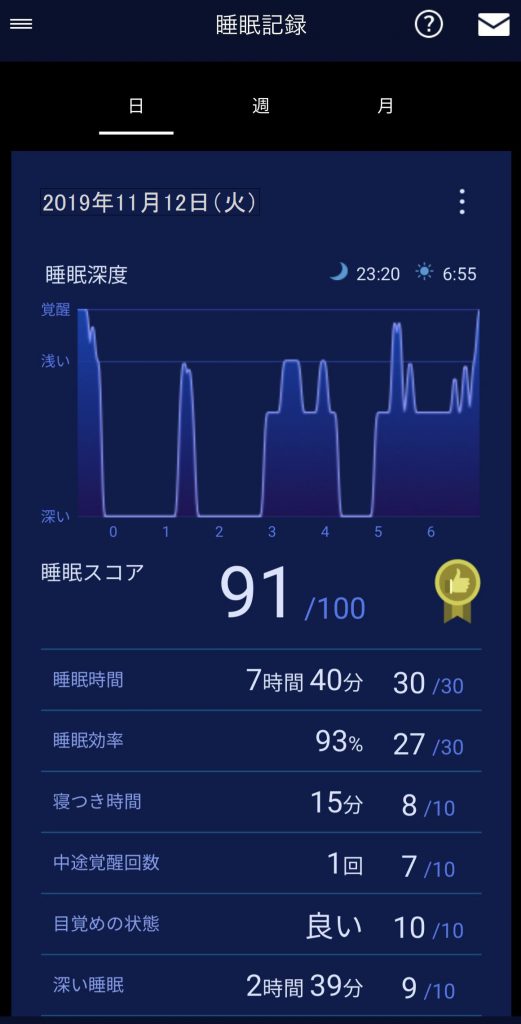 「睡眠スコア」は、「睡眠時間」「睡眠効率」「寝つきまでの時間」「中途覚醒回数」「目覚めの状態」「深い睡眠」の6項目で評価し、スコアを算出します。履歴は、 日次、週次、月次で表示し、振り返りが可能です。
