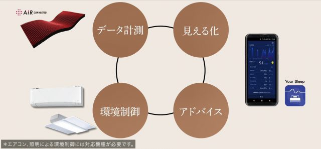 新たに開発したスマートフォン用のアプリを介して、西川のマットレスに搭載したセンサーで睡眠データを計測し、そのデータに基づいたパナソニックのエアコンによる寝室の温度・風向・風量制御や、照明器具によるあかりの自動調整を行います。