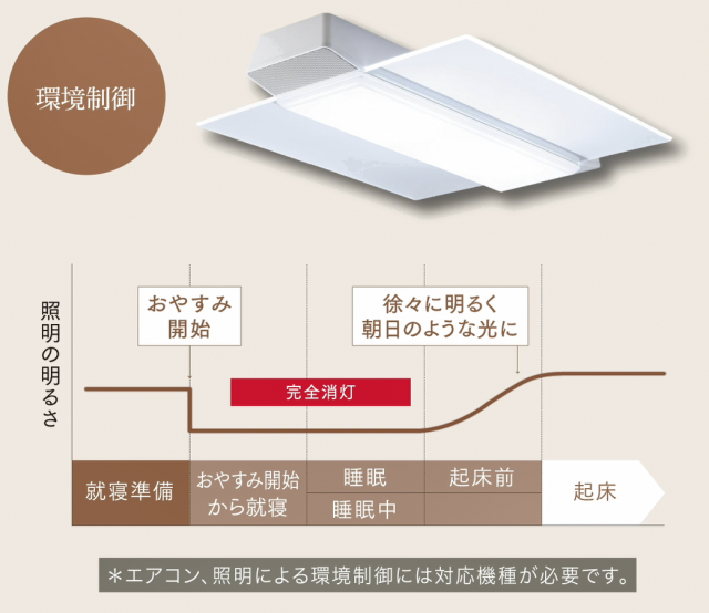 エアコンは、入眠したタイミングや睡眠状態にあわせて、快適な温度・風向・風量で運転します。起床に近づくにつれ、設定温度を徐々に上げていきます。LEDシーリングライトは、起床前の睡眠状態をみて、徐々に明るくし、すっきりした目覚め環境をサポートします。音楽は、おやすみ開始から音量を徐々に小さくコントロールして入眠検知後、自動で消音します。スマートフォンにダウンロード済みの好みの音楽の再生も可能です。