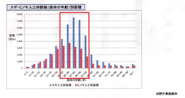 ちなみに、天然林の場合、広葉樹:針葉樹は1080万ha:238万ha。80%が広葉樹ですから、人工林、中でもスギ、ヒノキがいかに歪な割合なのかがお分かり頂けると思います。