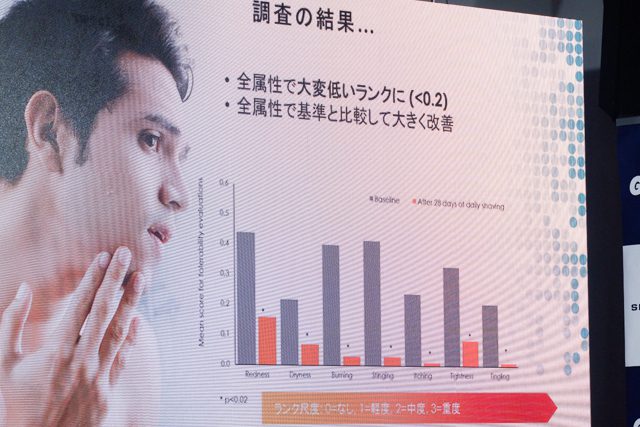 方法は、被験者に28日間、毎日ヒゲ剃りをしてもらいます。そして1日目と28日目の肌の状況(赤み、乾燥、荒れ、テカリなど)を皮膚科の医者が目視で各項目毎に点数を付けるというものです。