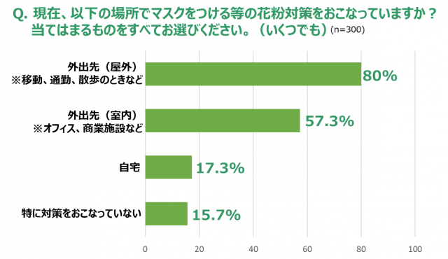 外出先や自宅などで花粉対策をしているかどうか聞いたところ、外出先では8割の人が花粉対策を行っているのに対し、自宅は約2割にとどまる結果になりました。