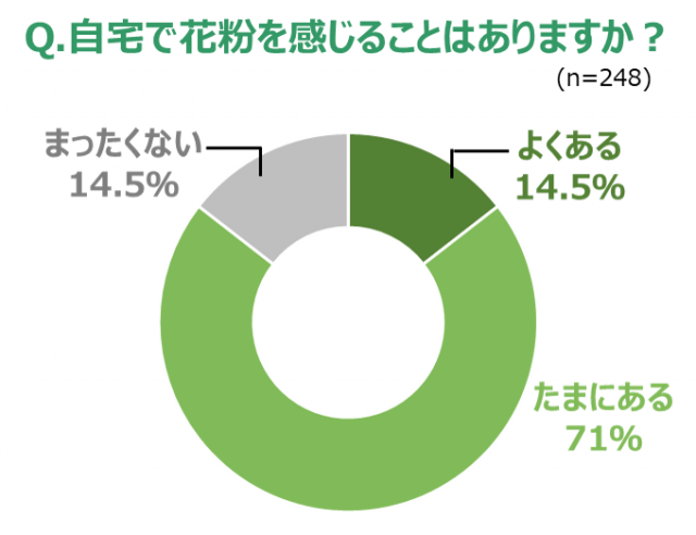■自宅で花粉を感じる人は約85% いて も、 家での対策は不十分な人が多い また、 自宅で花粉対策をしていない人に「自宅にいるときに『花粉』を感じるか」と聞いたところ、 2割弱が「よくある」、 そして約7割が「たまにある」と答えており、 大多数が家で花粉を感じつつも、 対策が不十分なまま過ごしていることが分かりました。