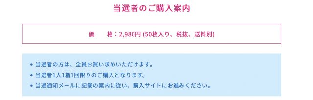| 販売数量: | 30,000箱 (50枚入/お一人様1箱限り) |