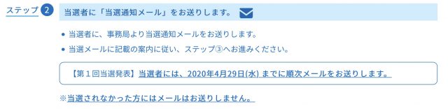 | 応募期間: | 2020年4月27日(月) 0:00~23:59 (期間中、いつお申し込みいただいても当選確率は同じです) |