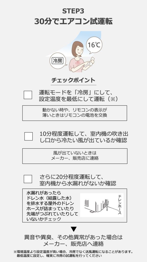 おかしなところがある場合は、6月中頃までに対応を。7月1日以降はエアコンが売れ始める=電気工事業者の手が空いていない時期に差し掛かりますので、対応が遅れることもあります。