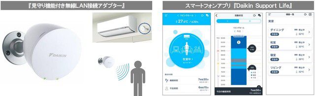 本商品は、専用のスマートフォンアプリ『Daikin Support Life』と、専用のセンサーデバイス『見守り機能付き無線 LAN 接続アダプター』を組み合わせたシステム。