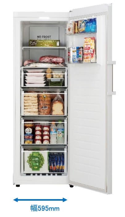買い物カゴ8.4個分の収納力を誇る大容量280Lにも関わらず、横幅は595mmで省スペース化を実現している点が、モデルの最も大きな特徴。これまで大容量冷凍庫といえば上開き式冷凍庫が一般的で、設置場所に悩んでしまうご家庭も多く見受けられました。本商品では高さを1,710mmに設定したことで、置き場所を選ばない、背が高くてコンパクトなサイズ感を実現しています。