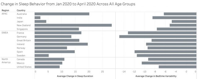 すべての国で睡眠時間の増加が見られました。ニュージーランド、オーストラリア、アイルランドでは特にその傾向が顕著で、逆にインド、日本、スウェーデンでは、変化は小さいものでした。就寝時間のブレの改善が大きかったのはフランスとドイツで、小さかったのは日本です。より良い睡眠習慣のためには就寝時間を規則正しくすることが大切です。