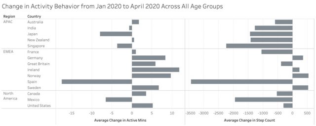 北アメリカとアジア太平洋諸国では歩数は減少していますが、ヨーロッパのいくつかの国(ドイツ、アイルランド、ノルウェー、スウェーデン)では増加するという結果となりました。