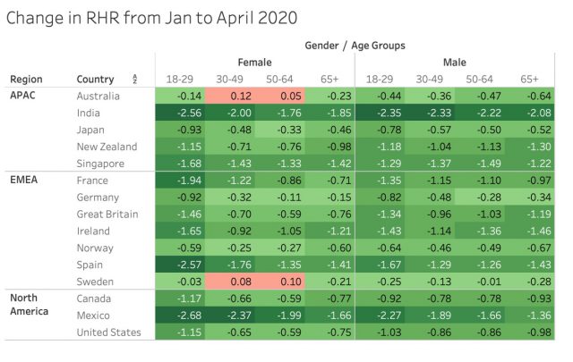フィットビットの目的は、「世界中の人々をより健康にする手助けをすること」ですが、それに威力を発揮するのが、ビッグデーター。世界中のユーザーの匿名データーの集まりです。今までは、健康理論との整合性をとってきましたが、今回、このパンデミックが人々の健康にどのような影響を与えるかについて分析したそうです。