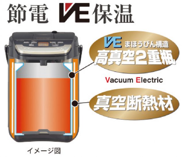 タイガー独自の「高真空2重瓶(VEまほうびん構造・ステンレス製)」の容器と、「真空断熱材」の2重真空構造で、通電を切って3時間たっても90度以上をキープ!
